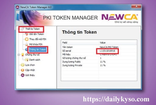 Bạn liên hệ nhà cung cấp chữ ký số qua tổng đài hổ trợ chữ ký số 19002066 hoặc Email: support@newca.vn và cung cấp thông tin serial token theo hình dưới: