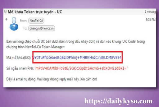 Bước 3: Khi bộ phận hỗ trợ ký thuật nhận được yêu cầu của bạn sẻ phản hồi bạn email thống báo mã UC để reset token do hệ thống của NewTel-CA gửi về email của người dùng. Coppy dòng mã UC nhân được trong mail như hình dưới: